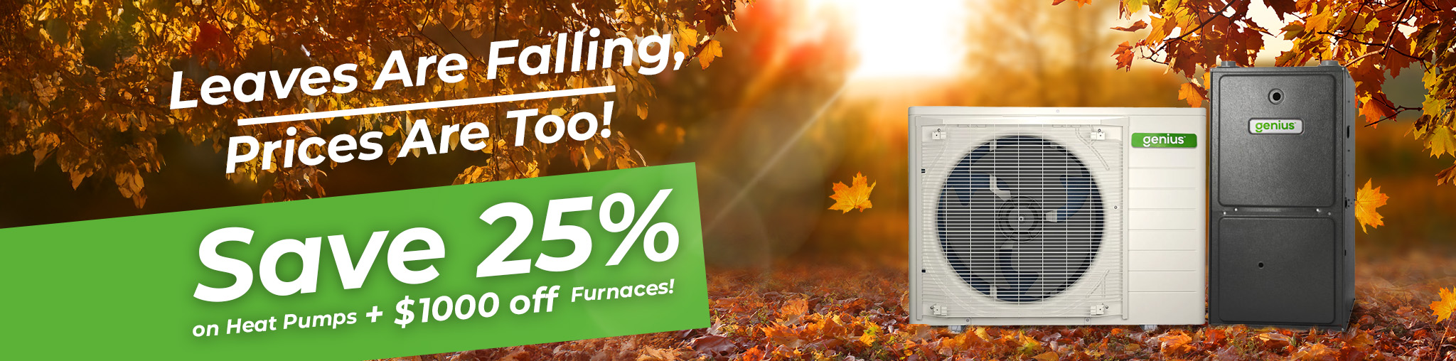 Fall is here, and that means cooler nights, cozy mornings, and making sure your home is ready for the season ahead. For a limited time, we’re helping you stay comfortable (and save big!) with 25% OFF our top-performing Heat Pumps plus $1000 OFF select high-efficiency Furnaces.