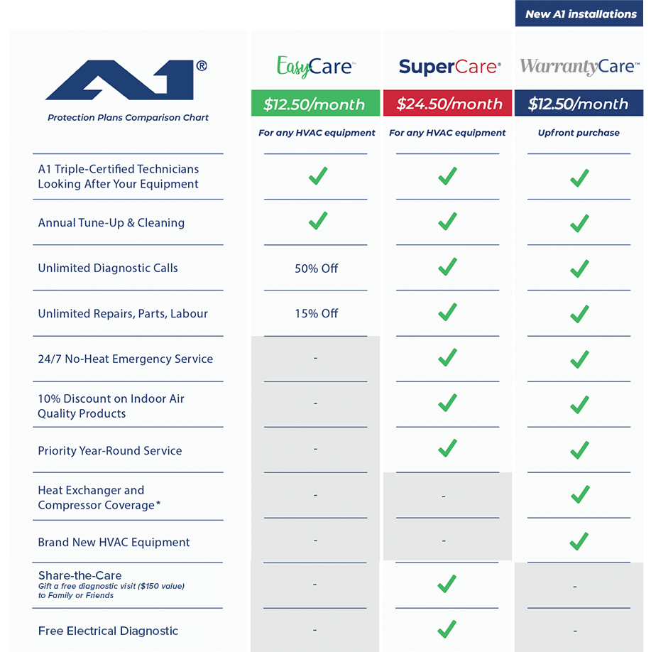 We cover every type of furnace and air conditioner out there, not just ones installed by our A1 team. Our expert A1 Technicians are so well-trained and experienced that we handle all brands of equipment. We will clearly tell you up front everything that’s included in your plan – such as unlimited repairs and no-charge service calls – and we stand by our work.